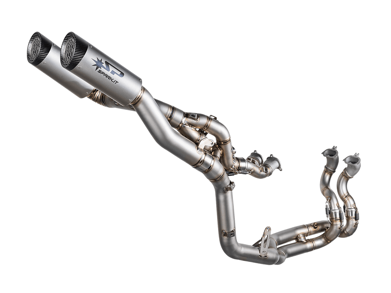 Spark Exhaust Systems. Spark system is the state-of-the-art product developed together with teams racing important championships all over the world. Besides the study of the collectors' best sizing for performance optimization, the technologies and the structural details of such product ensure top reliability. In fact, many teams have chosen Spark to face the Endurance World Championship. From the aesthetic point of view the segmented connecting tube is striking, with visible weldings enhancing the racing soul of the product. Weldings, segments and cones that are not merely a formal exercise but necessary solutions: after repeated bench tests such specific cones - out of the production standards - have been chosen as they allow the best torque. Handcrafted in Italy. Ultra lightweight approximately 2.2kg.