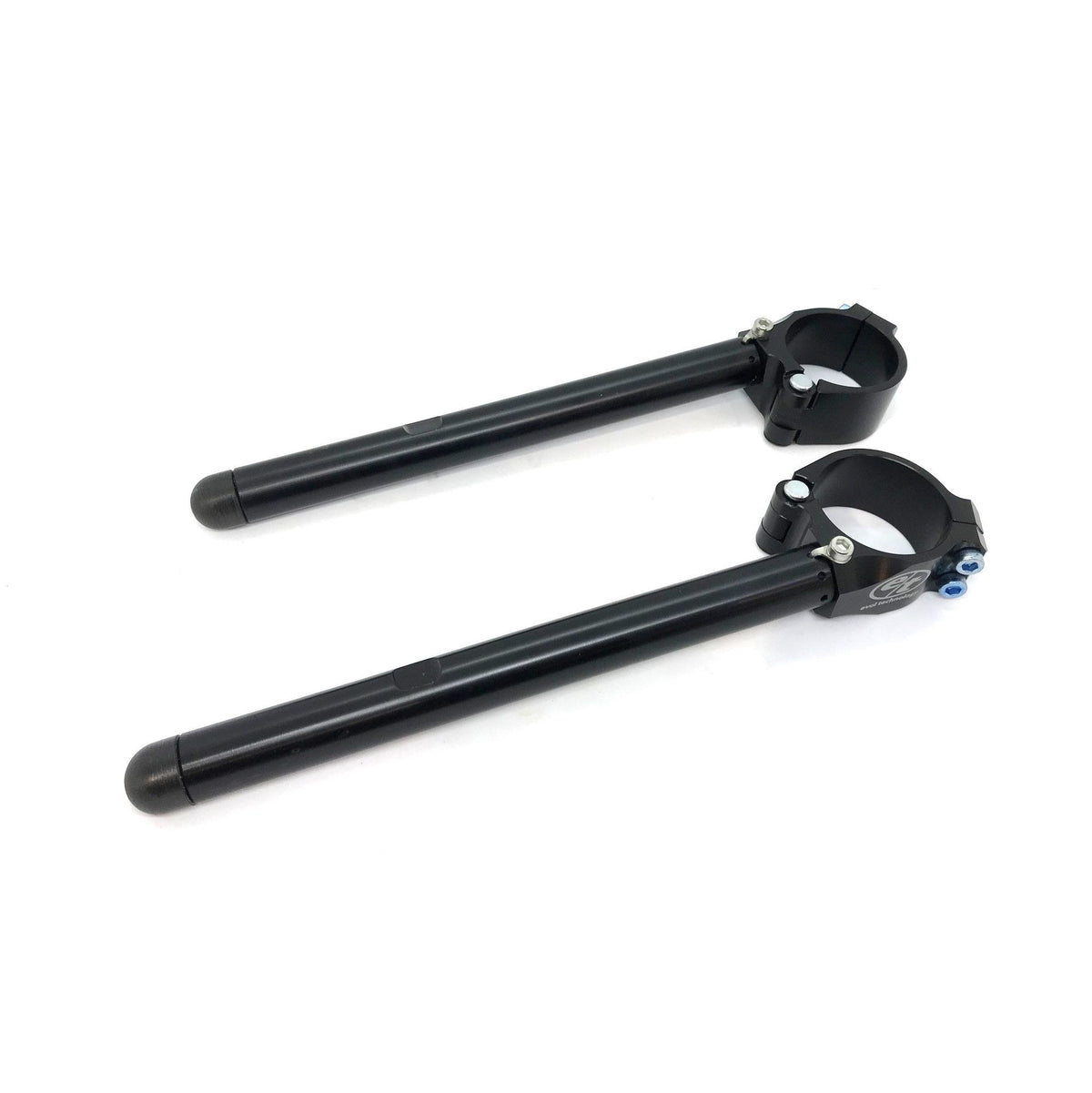 Different by design, our clip-ons place the handlebars tangent to the leading edge of the fork tubes. This design pulls the bars forward about 25mm from conventional clip-ons, which translates to a “flatter” bar angle for a more bio-mechanically advantaged riding style (think Ben Spies, with his elbows-out technique). They are also ideal for smaller riders. The downward angle of the bars is the racing standard 7 degrees.