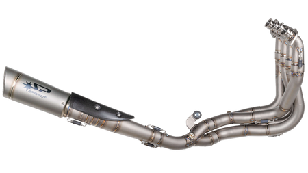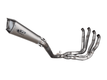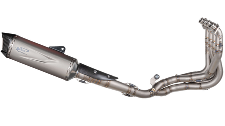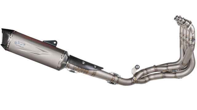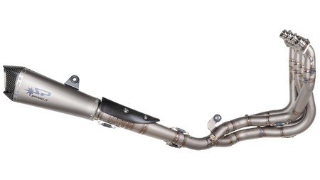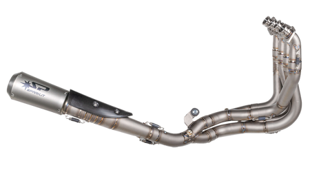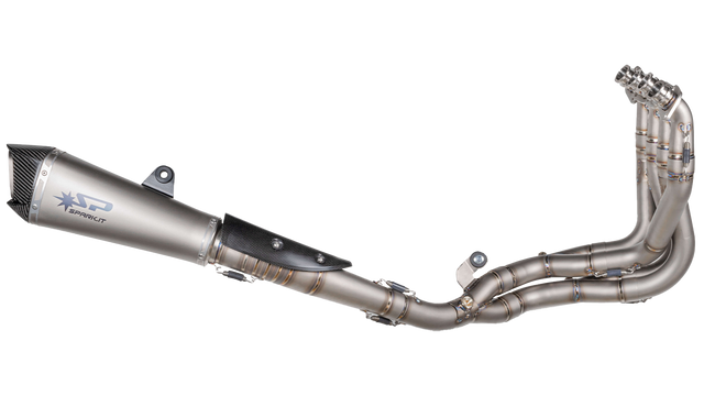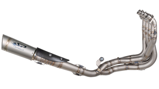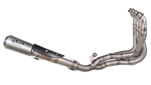 Spark Exhaust Systems. Spark system is the state-of-the-art product developed together with teams racing important championships all over the world. Besides the study of the collectors' best sizing for performance optimization, the technologies and the structural details of such product ensure top reliability. In fact, many teams have chosen Spark to face the Endurance World Championship. From the aesthetic point of view the segmented connecting tube is striking, with visible weldings enhancing the racing soul of the product. Weldings, segments and cones that are not merely a formal exercise but necessary solutions: after repeated bench tests such specific cones - out of the production standards - have been chosen as they allow the best torque. Handcrafted in Italy. Ultra lightweight approximately 2.2kg.