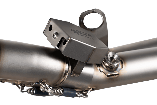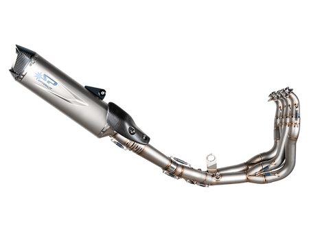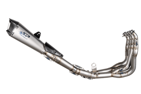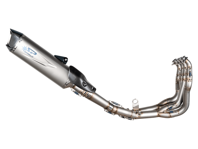 Spark Exhaust Systems. Spark system is the state-of-the-art product developed together with teams racing important championships all over the world. Besides the study of the collectors' best sizing for performance optimization, the technologies and the structural details of such product ensure top reliability. In fact, many teams have chosen Spark to face the Endurance World Championship. From the aesthetic point of view the segmented connecting tube is striking, with visible weldings enhancing the racing soul of the product. Weldings, segments and cones that are not merely a formal exercise but necessary solutions: after repeated bench tests such specific cones - out of the production standards - have been chosen as they allow the best torque. Handcrafted in Italy. Ultra lightweight approximately 2.2kg.