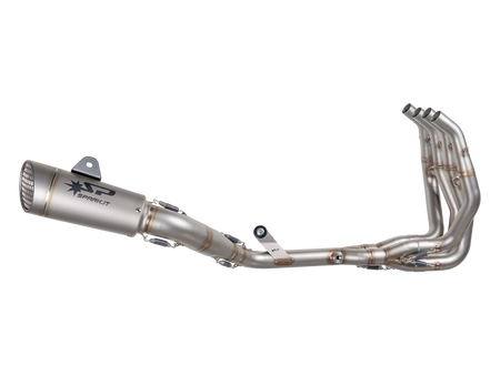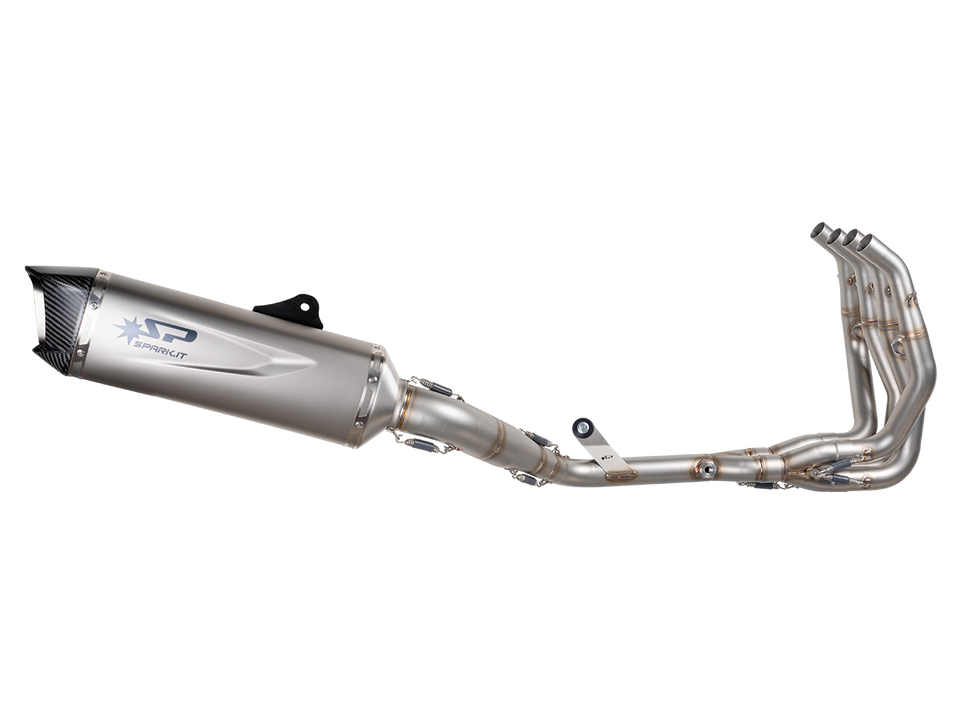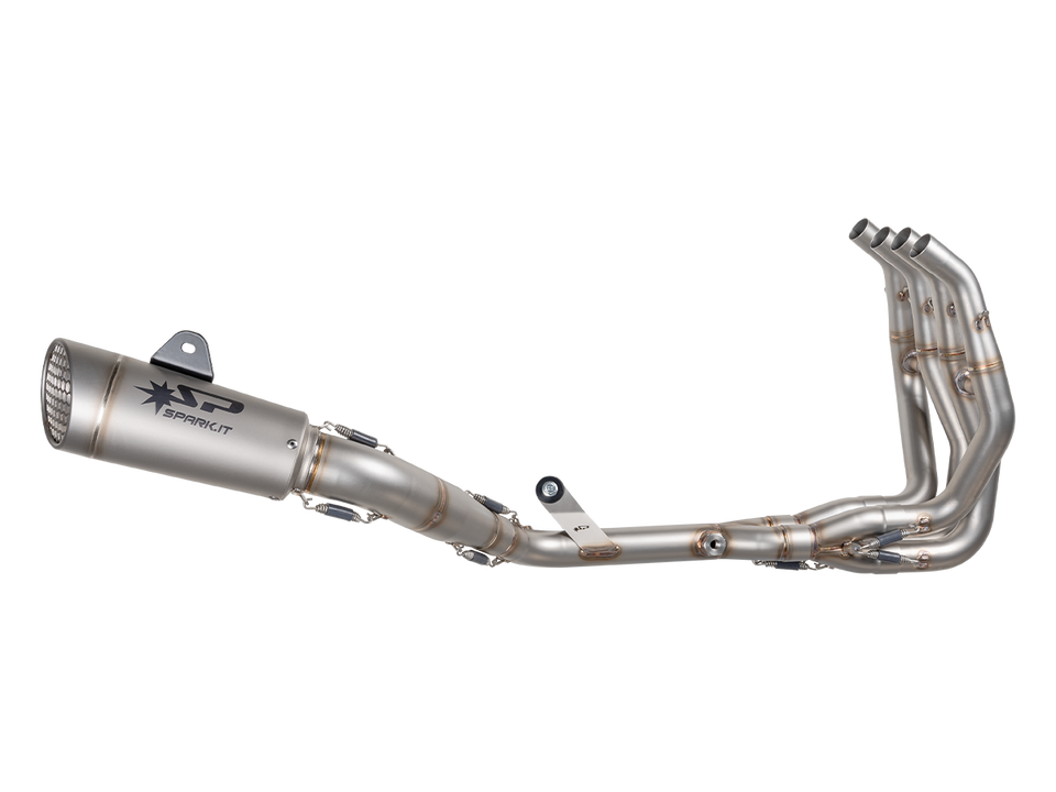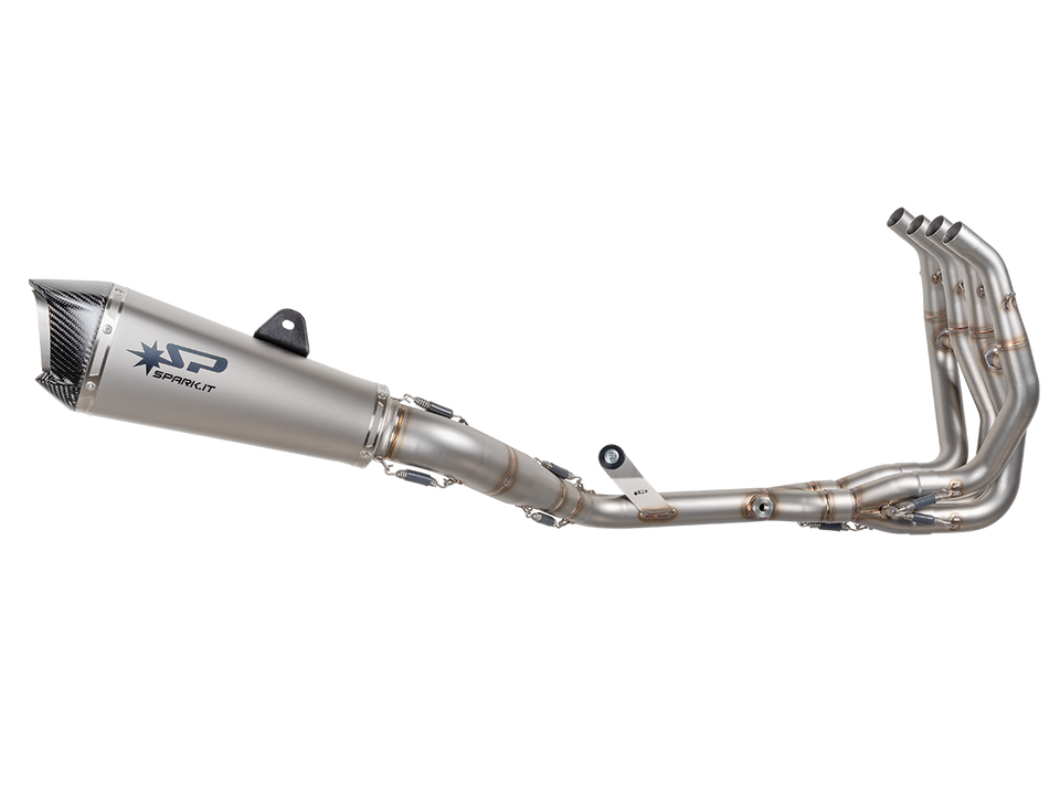 Spark Exhaust Systems. Spark system is the state-of-the-art product developed together with teams racing important championships all over the world. Besides the study of the collectors' best sizing for performance optimization, the technologies and the structural details of such product ensure top reliability. In fact, many teams have chosen Spark to face the Endurance World Championship. From the aesthetic point of view the segmented connecting tube is striking, with visible weldings enhancing the racing soul of the product. Weldings, segments and cones that are not merely a formal exercise but necessary solutions: after repeated bench tests such specific cones - out of the production standards - have been chosen as they allow the best torque. Handcrafted in Italy. Ultra lightweight approximately 2.2kg.