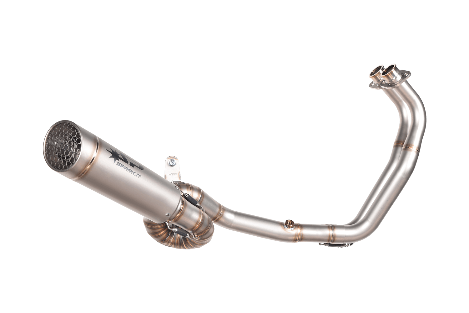Spark Exhaust Systems. Spark system is the state-of-the-art product developed together with teams racing important championships all over the world. Besides the study of the collectors' best sizing for performance optimization, the technologies and the structural details of such product ensure top reliability. In fact, many teams have chosen Spark to face the Endurance World Championship. From the aesthetic point of view the segmented connecting tube is striking, with visible weldings enhancing the racing soul of the product. Weldings, segments and cones that are not merely a formal exercise but necessary solutions: after repeated bench tests such specific cones - out of the production standards - have been chosen as they allow the best torque. Handcrafted in Italy. Ultra lightweight approximately 2.2kg.