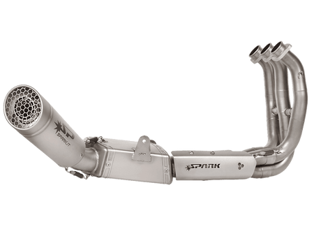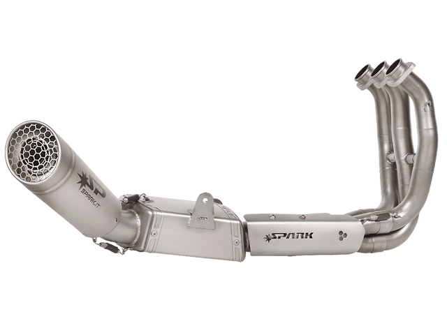 Spark Exhaust Systems. Spark system is the state-of-the-art product developed together with teams racing important championships all over the world. Besides the study of the collectors' best sizing for performance optimization, the technologies and the structural details of such product ensure top reliability. In fact, many teams have chosen Spark to face the Endurance World Championship. From the aesthetic point of view the segmented connecting tube is striking, with visible weldings enhancing the racing soul of the product. Weldings, segments and cones that are not merely a formal exercise but necessary solutions: after repeated bench tests such specific cones - out of the production standards - have been chosen as they allow the best torque. Handcrafted in Italy. Ultra lightweight approximately 2.2kg.